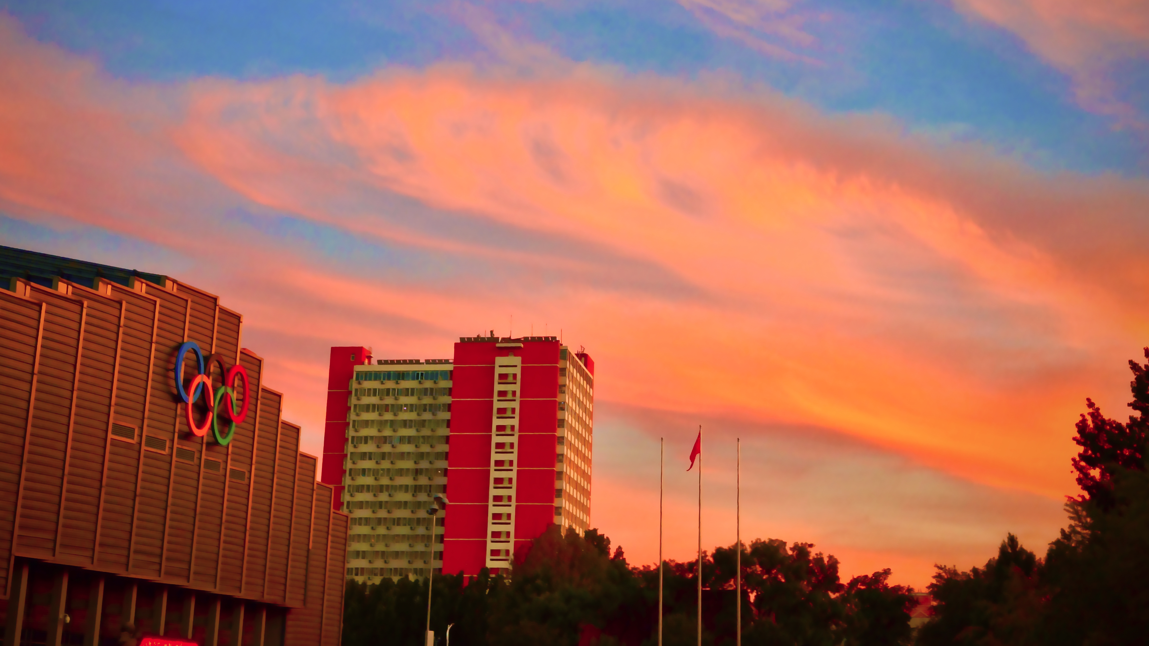 主题阐释:夕阳晚照,红霞映空,农大的公主楼和奥运场馆在夕阳下熠熠生辉