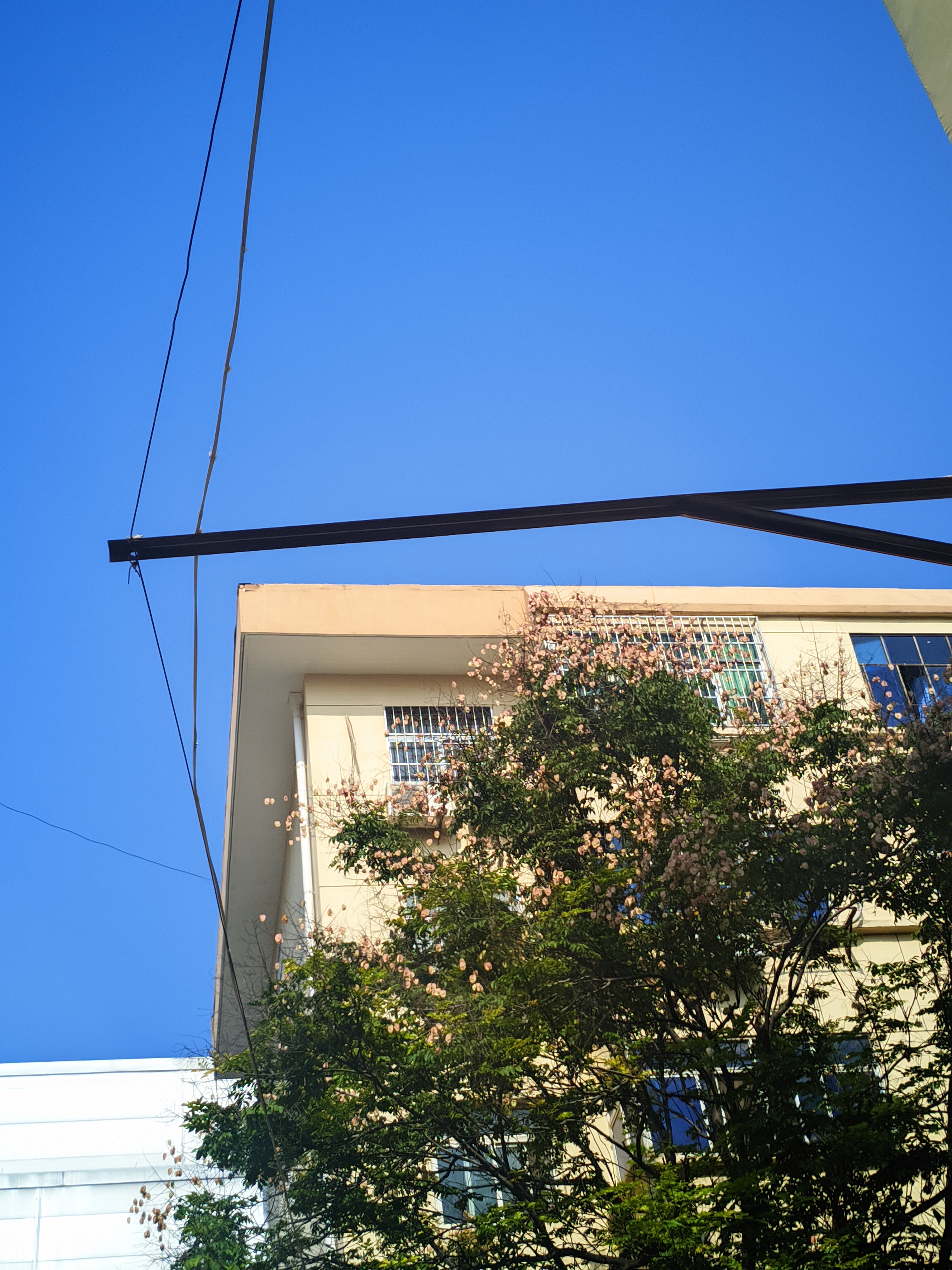 主题阐释:在澄澈的蓝天幕布下,建筑的棱角与树木的柔枝相遇,粉白的花簇在枝叶间轻颤,电线与钢架勾勒出城市的肌理。这是都市里的一隅日常,却因光影与色彩的碰撞,晕染出别样的诗意。