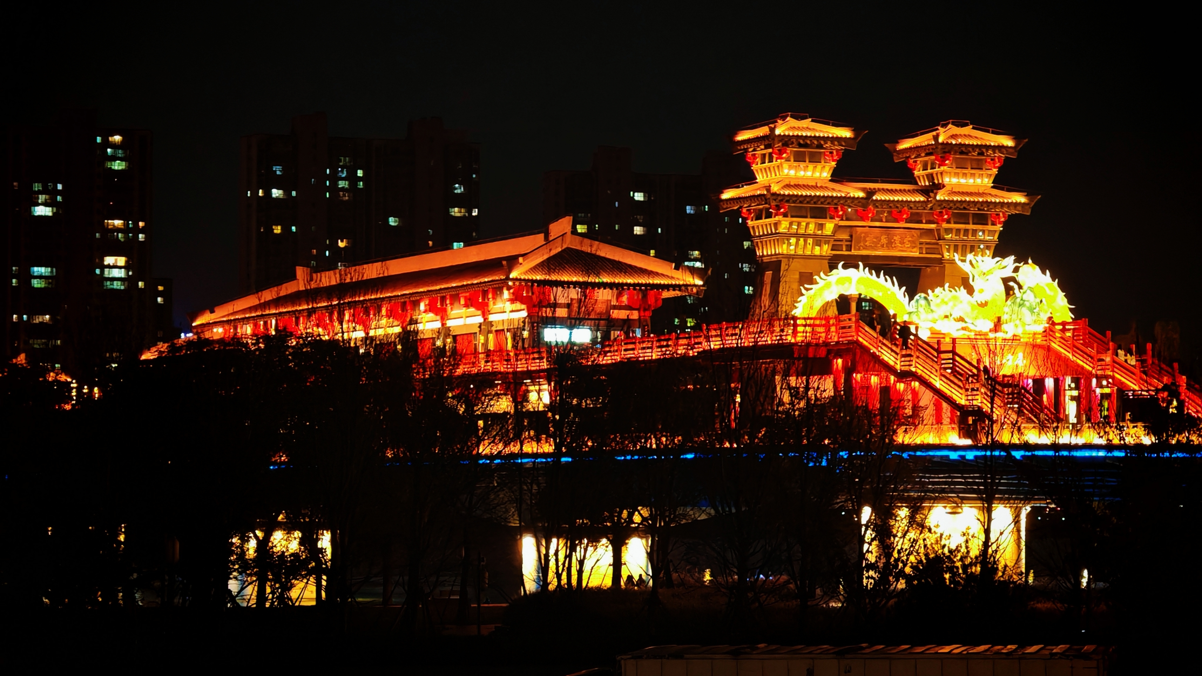 姓名:秦子洋学校名称:咸阳师范学院年级及专业:2024级视觉传达设计主题阐释:用夜色里的暖光勾勒古渡廊桥的飞檐与龙形灯组,让传统建筑的朱红与鎏金,在现代楼宇的剪影里流淌成一条跨越时空的光河,既定格了千年渡口岸边的新烟火,也让历史的余温在城市的呼吸里轻轻震颤。