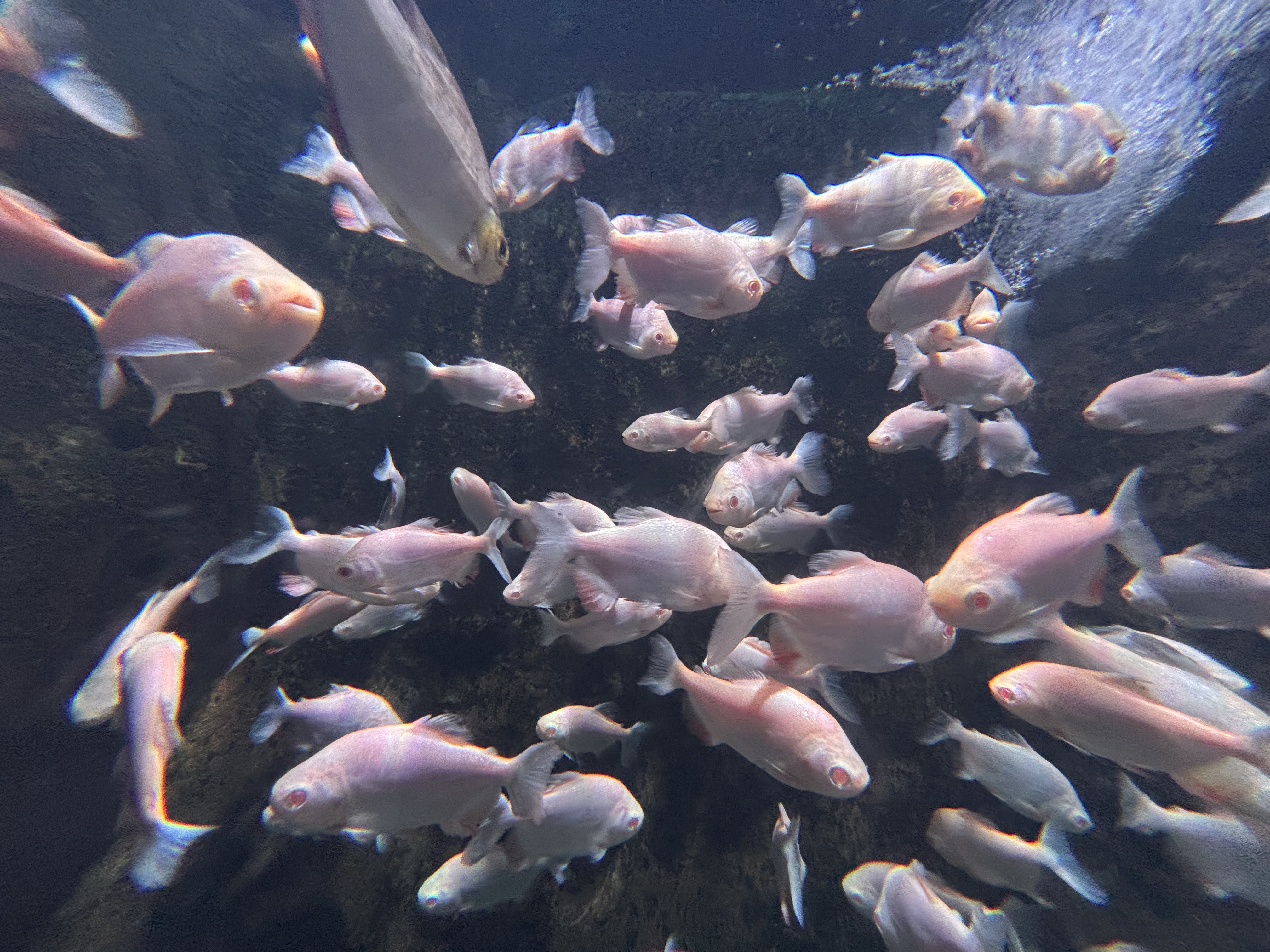 主题阐释:深色水下空间中,数十尾粉色淡水鱼聚集游动,鱼群排布错落且动态十足,客观呈现出水生生物的自然聚散状态。
