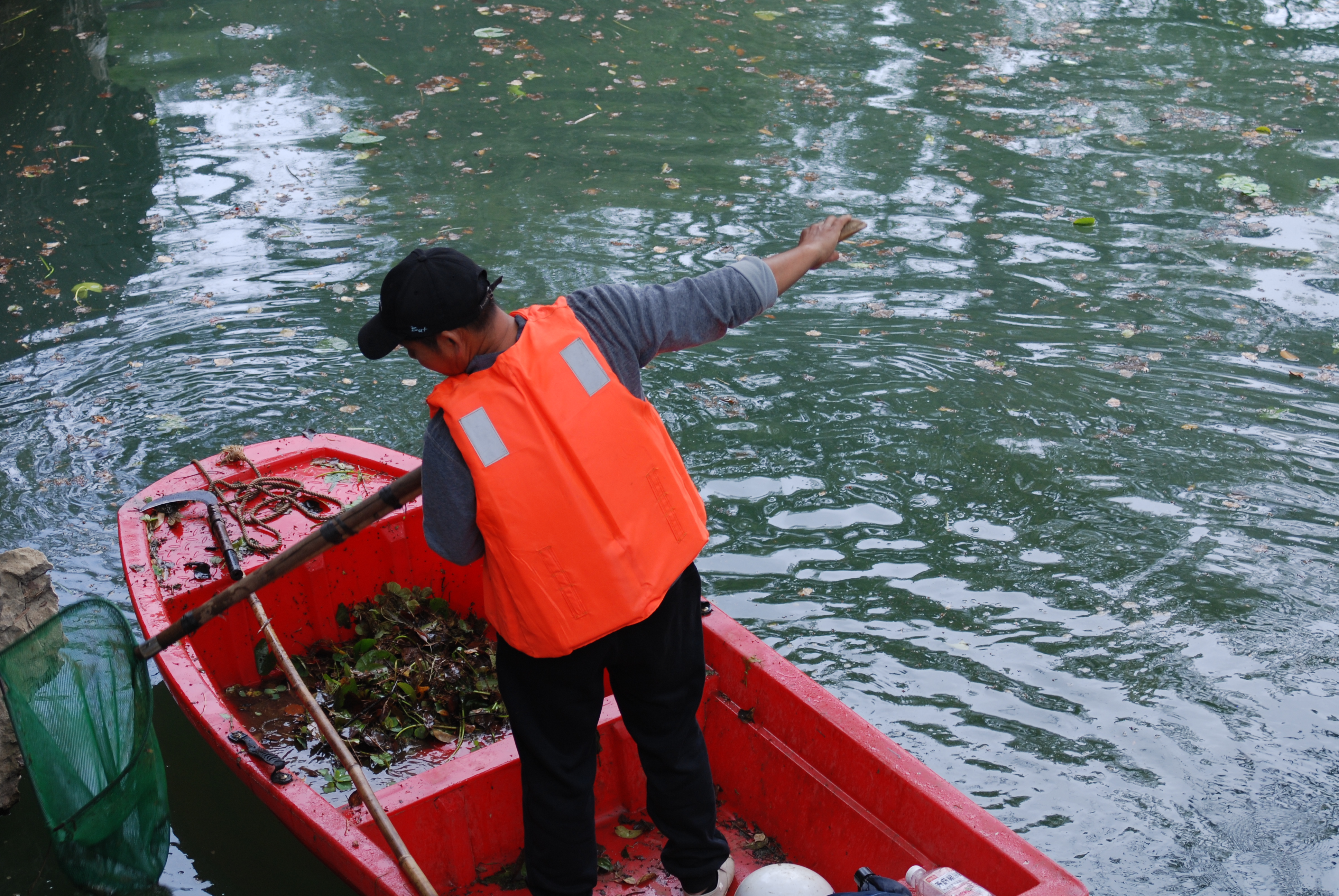 他俯身打捞的不仅是落叶与杂物,更是在为河流“擦拭”褶皱的水纹;小船里堆积的枯枝,是他为生态秩序整理的注脚。这平凡的劳作,没有宏大叙事,却以日复一日的躬身,让流动的水脉始终保持澄澈的呼吸,让城市与自然的共生,藏在每一次挥臂的弧度里。