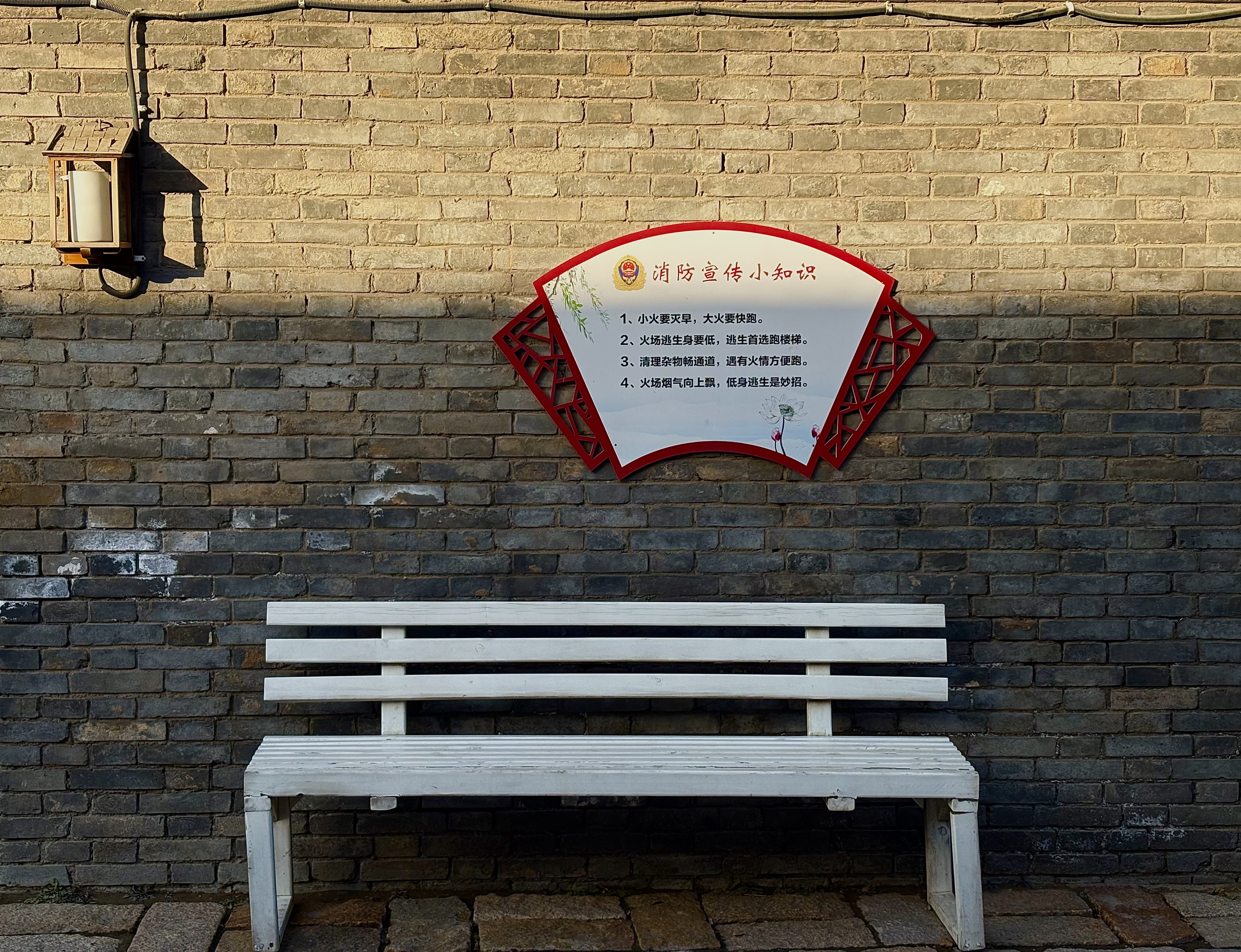姓名:肖雅文学校名称:开封大学年级及专业:25级融媒体技术与运营主题阐释:开封的青砖老墙晕染着岁月的斑驳,现代长椅空落的位置成了时光的留白,消防标识的亮色又为这份古朴静谧添上了现代生活的温柔注脚。阳光照射到老墙上形成了一条分割线,给人一种人们都安居乐业的静谧之感。