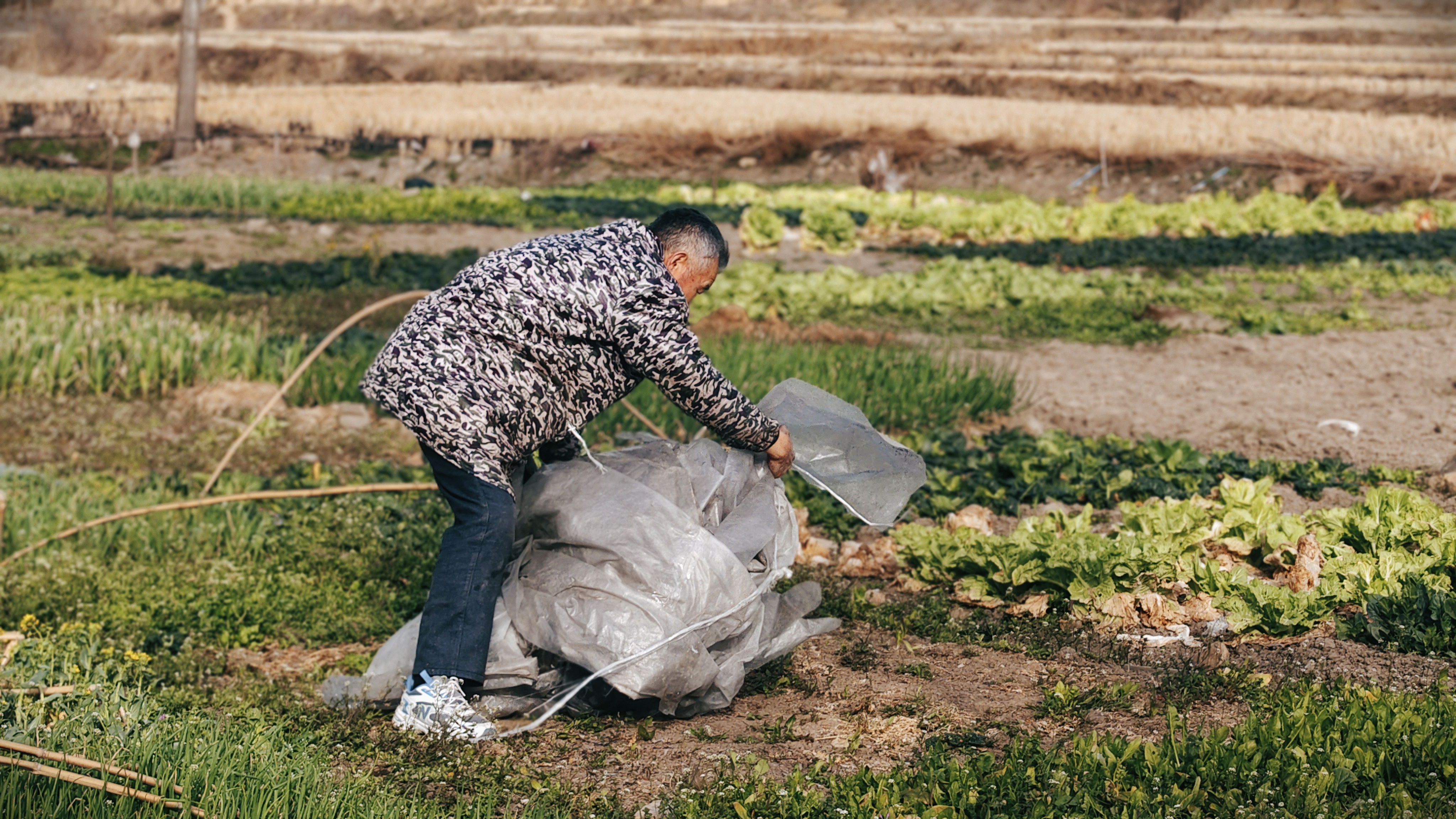 拍摄于春日午后的乡村菜地。我捕捉到一位老人在田间整理塑料薄膜的瞬间,褶皱的薄膜像极了土地的肌理与生活的纹路。这褶皱,既是抵御春寒的屏障,也是孕育新生的希望;既是劳作的痕迹,也是岁月的注脚。