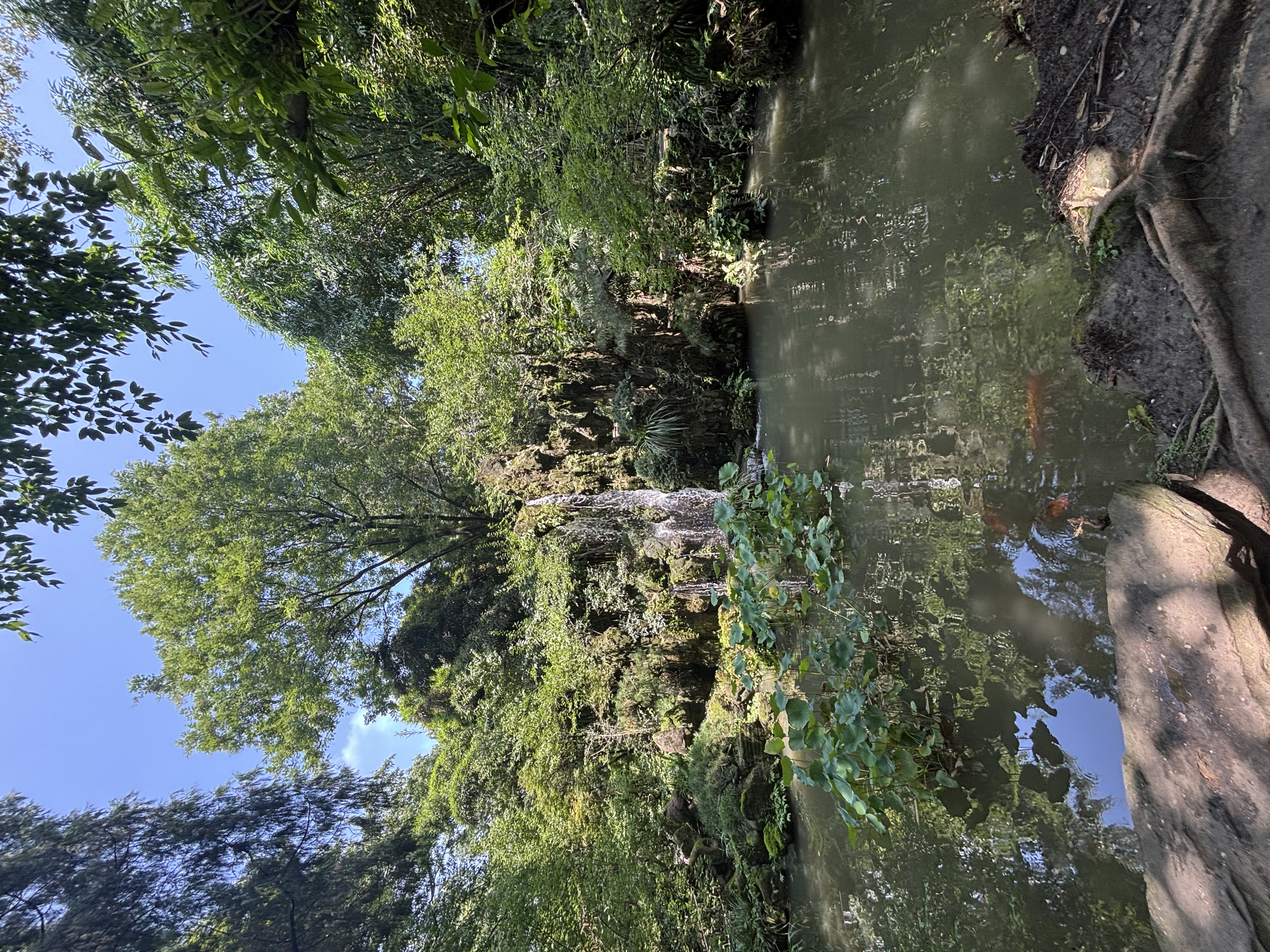 画面视觉中心是一汪静谧的池塘,水质呈温润的浅褐色,水面平滑如镜,清晰倒映着岸边的浓绿枝叶与天光。池中几丛荷叶舒展着嫩绿的叶片,为沉静的水面添了几分生机,隐约可见红色锦鲤摆尾游弋,漾开细碎的涟漪。池塘尽头,一道瀑布从覆满苔藓的嶙峋假山间垂落,水流不算湍急,却在石面上溅起细碎的水花,潺潺水声仿佛穿透画面,与池鱼的悠然、荷叶的静立形成鲜明的动静对比。